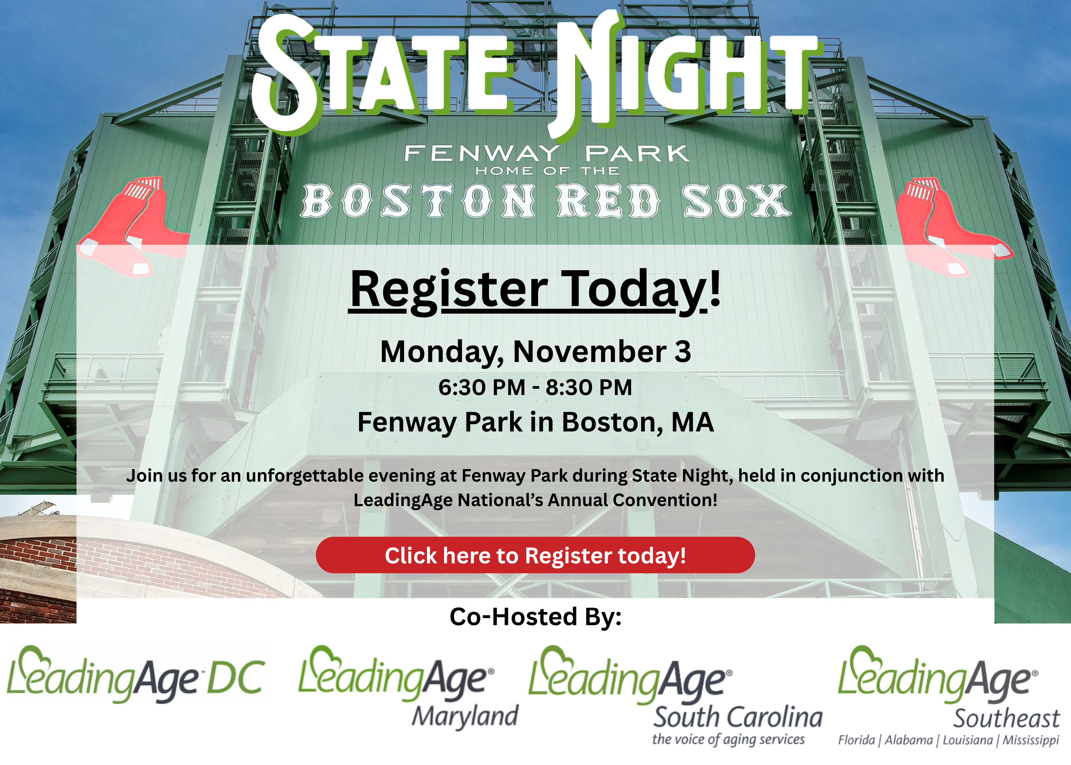 Step into the iconic Fenway Park and join senior living leaders from across Florida, Alabama, Louisiana, Mississippi, South Carolina, Maryland, and DC for an exclusive night of networking, camaraderie, and celebration.